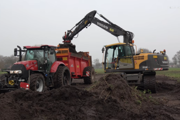 2026 — Melk en pluimveebedrijf de Kooyen aan het werk met hun Case IH Maxxum 125 en een Miro Heywang SH55 meststrooier en Volvo EW160C graafmachine van loonbedrijf Fa Fokkert (Den Ham). Daarnaast zien we ze ook nog rond het veld gaan met hun Case IH Puma 185 CVX en een Ortolan frees. nagd2010