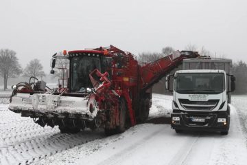 Holmer Terra Dos T4.40 aan het bieten rooien in de sneeuw net over de grens in Duitsland. (Kalkar) 2026