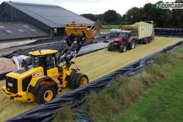 Loonbedrijf Krans uit De Wilp (Gr.) is bezig met een blok van 10 ha mais te oogsten. Dit doen zij met een Claas Jaguar 940 met 8 rijige Claas maisbek. Voor de afvoer rijden een Case Puma 200 en een CVX 195 beide met Kaweco Radium 50. Noordagribeeld
