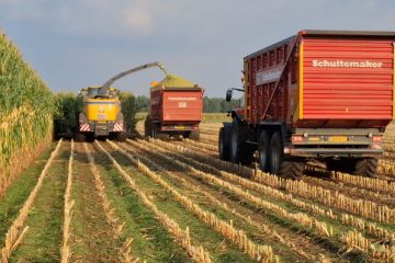 Laatste mais van 2025 hakselen – Loonbedrijf Pekkeriet hakselde en reed dit keer met drie trekker-wagen combinaties, mts Maat reed wederom zelf aan met de Werklust. New Holland FR550 hakselaar en MF trekkers. Sjanzo