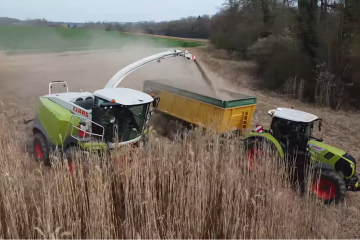 Miscanthus-oogst 2026 op de landbouwschool Courcelles-Chaussy in Frankrijk Claas hakselaar en trekkers. – Emile Agri Drone 54