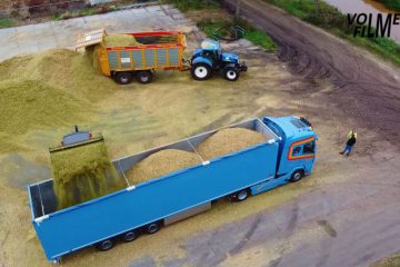Loonbedrijf Scheper aan het mais hakselen met een New Holland FR9080 en New Holland trekkers . Transport met diverse trucks. VolmerFilm