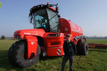 Loonbedrijf Te Bokkel Aalten met de nieuwe Vervaet-vijfwieler aan het zodebemesten 2026. Trekkerweb.nl