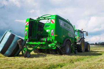 McHale Fusion met 4 wielen op rij. Deze McHale Fusion 4 Plus rondebalenpers met wikkelaar van de Ierse fabrikant is voorzien van een zelfgebouwd onderstel met vier wielen. Het onderstel, dat is gebouwd door importeur LMB Roelofs uit Bennekom (Gld.), bestaat uit twee kleinere wielen die tussen de buitenste wielen zijn gemonteerd. Van de Weijer Filmstudio