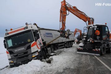 Vrachtwagen van de weg — GENEMUIDEN – Op de Kamperzeedijk, de N760, vlak voor de rotonde met de Tagweg en de Randweg is woensdag net na het middaguur een vrachtwagencombinatie van de weg geraakt door gladheid . Henry Wallinga